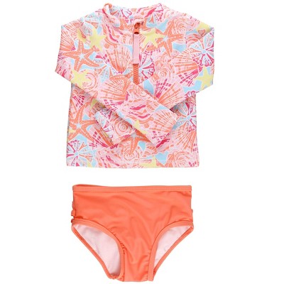 RuffleButts Baby/Toddler Girls UPF50+ Long Sleeve Zipper Rash Guard 2-Piece