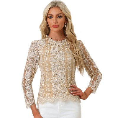 INSPIRE CHIC Women's See Through Mock Neck Long Sleeve Floral Lace Blouse