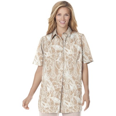 Tops are a closet staple and there are tons of different styles. Let’s start with the essentials. Women’s shirts are your go-to for everyday wear. Think classic button-downs, relaxed tees, and fitted crewnecks—all foundational pieces that pair effortlessly with jeans, skirts, or trousers. These tops are ideal for layering or standing alone and are available in a wide range of materials, from breathable cotton to soft jersey knits. With neutral tones and playful prints to choose from, it’s easy to build outfits that feel both comfortable and stylish.