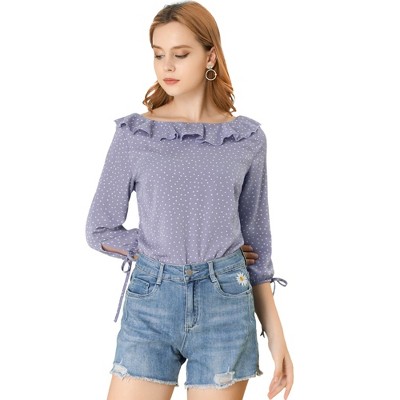 Allegra K Women's Vintage 3/4 Sleeve Boat Neck Ruffled Dots Print Blouse
