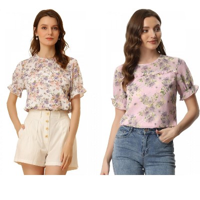INSPIRE CHIC Women's Ruffle V Neck Puff Sleeve Summer Casual Chiffon Peasant Top