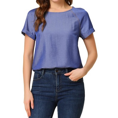 INSPIRE CHIC Women's Round Neck Raglan Sleeves Side Slit Chambray Top