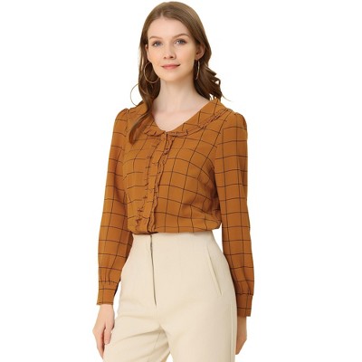 INSPIRE CHIC Women's Peasant Round Neck Ruffles Puff Sleeve Gingham Plaid Blouse