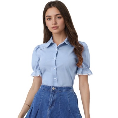 INSPIRE CHIC Women's Puff Sleeve Crew Neck Lace Trim Cotton Top