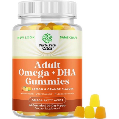 Omega-3 Gummies for Adults, Vegetarian Omega 3 6 9 DHA Gummies for Brain, Bone, Heart & Joint Support, Lemon & Orange Flavors, Nature's Craft