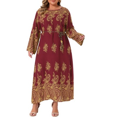 Women's Plus Size Boho Pattern Crew Neck Long Sleeve Flowy Casual A Line Maxi Dress with Belt - Agnes Orinda