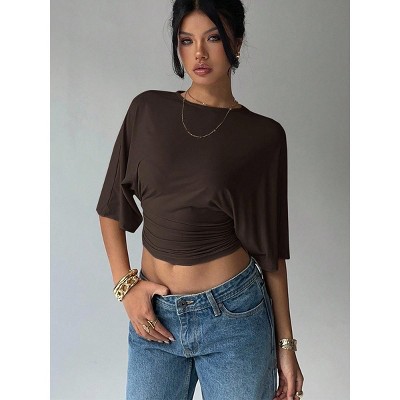 Women Batwing Sleeve Cropped Top Casual Loose Fit Ruched Waist Crop T-Shirt