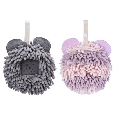 REGALWOVEN 2 Packs Chenille Fuzzy Cute Bear Shape Decorative Soft Absorbent Hanging Ball Hand Towels 7" x 7"