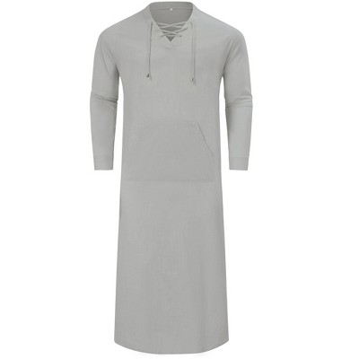 Clearlove Men's Long Sleeve Kaftan Thobe Robe Linen Cotton Blend Side Slit Lounge Shirt with Pockets Relaxation Wear