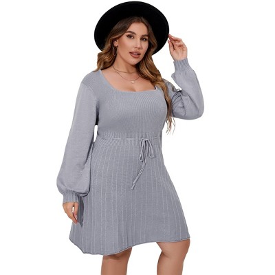 Womens Plus Size Sweater Knit Dress Long Sleeves Square Neck Tie Front Casual Midi Pullover Dress with Pockets