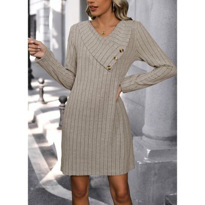Women's Solid Color Brushed Rib Knit Dress with Asymmetric Button Collar, Straight - Fit Long - Sleeve Dress for Casual and Office Wear
