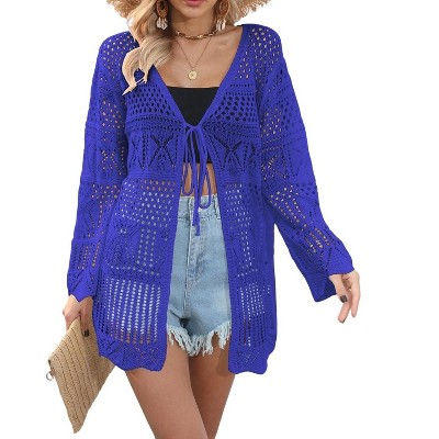 Women Crochet Cardigan Tie Front Long Sleeve Lightweight Cover Up Oversized Hollow Out Summer Cardigans