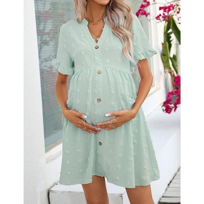 Coolmee Women's Maternity V Neck Dress Casual Ruffle Long Sleeve Button Down Midi Fall Dresses for Baby Shower Photoshoot