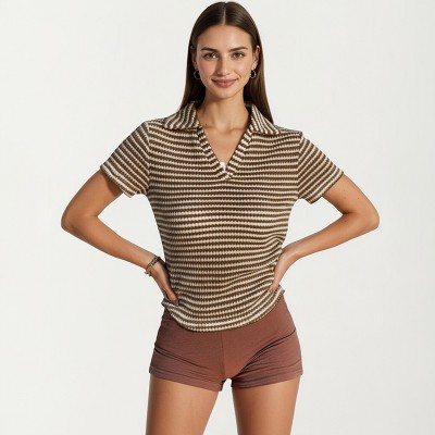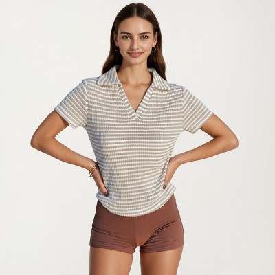 Anna-Kaci Women's Short Sleeve Collared Knit Top with Striped Pattern and V-Neckline