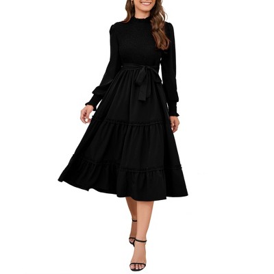 Women's Ruffle Mock Neck Long Sleeve Smocked Midi Dress Casual Elastic Waist Tiered Long Dress