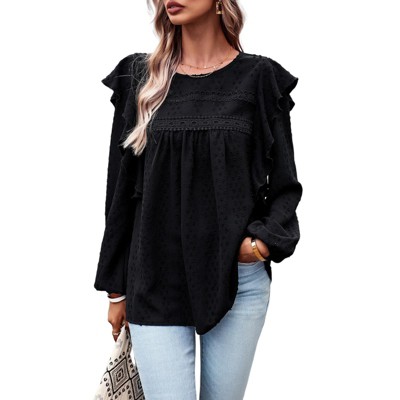 Frill Shoulder Boluse with Tiny Embroidered Lightweight Long Sleeve Crochet Blouse Lantern Sleeve Round Neck Tunic Blouse