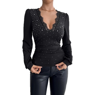 Women's Deep V Neck Long Sleeve Top Lace Rhinestone Slim Fit Blouse