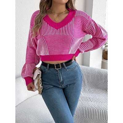 Women's Striped V Neck Puff Sleeve Cropped Pullover Sweater
