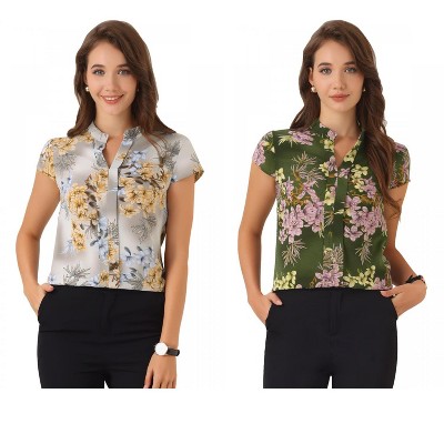 INSPIRE CHIC Women's Satin Stand Collar Work Cap Sleeve Floral Blouse 2 Packs