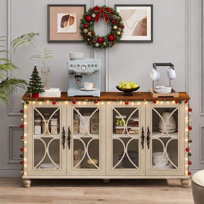 LOVSON 59.45"L Elegant European antique style 4-door cabinet with tempered glass doors for dining room, living room and hallway,Beige
