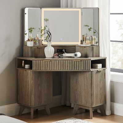 Corner Makeup Vanity Desk with LED Mirror & Charging Station, 48" Fluted Vanity Table with Glass Top & Storage Cabinets