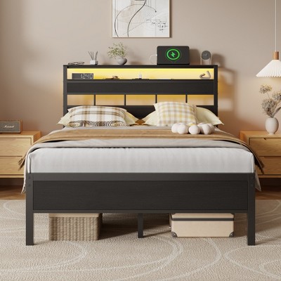 Full Size Bed Frame With Charging Station LED Lights Wood Storage Headboard 2 Tier Shelves Heavy Duty Metal Platform No Box Spring Needed Bedroom
