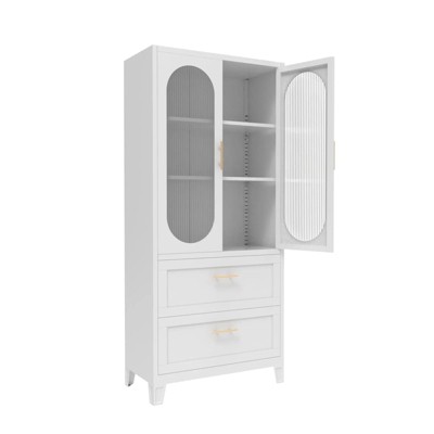 ZACHVO Freestanding Metal Storage Cabinet with Acrylic Glass Doors, 2 Drawers, Adjustable Shelves, Feet, White