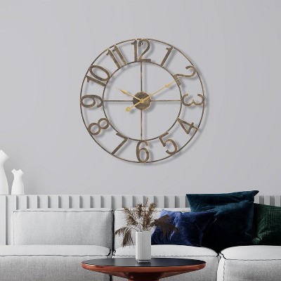 Add a timeless accent to your decor with a stylish or simply functional wall clock. An oversized black metal clock helps create an interesting focal point in your living room interior or any space. Target is a go-to, whether you’re looking for a wooden farmhouse-style clock or a decorative wall clock with metal color & a vintage brass finish. Check out Target.com to find the perfect wall clock to complement your decor style & taste. A large wall clock with black minute hands & modern roman numerals on an off-white base makes a minimalist statement to spruce up any bare wall. Dress up your mantel with a decorative wood clock with stylized arabic numerals or bring alive your kitchen space with rustic timepiece with a pendulum & chimes. Like your silence better? Choose an analog wall clock with a non-ticking design that pairs perfectly with an understated, modern aesthetic.
