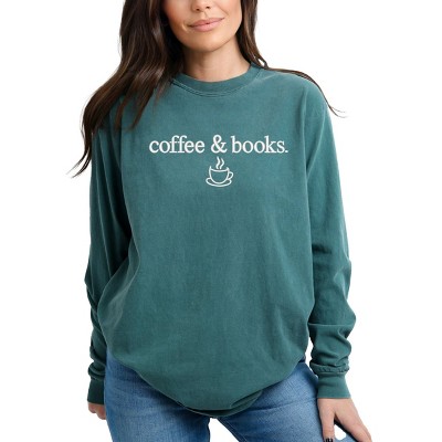 Embroidered Coffee & Books - Women's Garment Dyed Long Sleeve Graphic T-Shirt