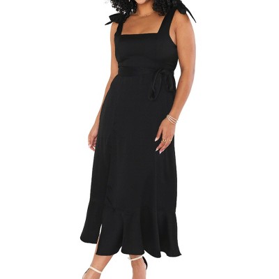 Womens Sleeveless Maxi Dress Square Neck Tie Waist Side Slit Ruffled Hem Dress