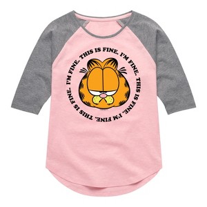Garfield - I'm Fine This Is Fine - Toddler & Youth Girls Raglan Graphic T-Shirt - Bring the humor and laziness of the famous orange cat to your wardrobe with Garfield graphic apparel. Featuring Garfield, Odie, and Jon, these designs celebrate the iconic comic strip and its beloved characters.