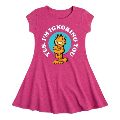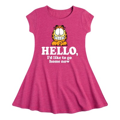 Garfield - I Hate Mondays Badge - Toddler And Youth Girls Fit And Flare Dress - Bring the humor and laziness of the famous orange cat to your wardrobe with Garfield graphic apparel. Featuring Garfield, Odie, and Jon, these designs celebrate the iconic comic strip and its beloved characters.