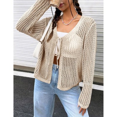 Material This women's cardigan is crafted from skin-friendly, soft, and breathable knit fabric, providing you with a comfortable wearing experience. Features Designed as a lightweight summer cardigan, this open front tie-front piece features long sleeves and a hollow-out design in a solid color. It’s the perfect blend of style and comfort. Match The knit shrug bolero cardigan pairs beautifully with a variety of outfits, including dresses, camisoles, tank tops, sleeveless blouses, jeans, leggings, skirts, and shorts. It’s ideal for traveling, beach outings, cocktail events, or adding an extra layer to party dresses. Occasion This versatile shrug is always in style, making it suitable for any season—spring, summer, fall, or winter. It’s perfect for a wide range of occasions, including parties, dates, travel, holidays, office wear, school, cocktails, and more.