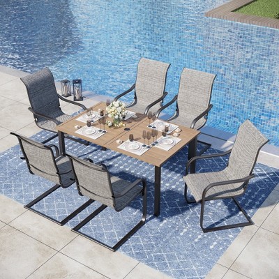 - Comfortable Cushioned Chairs: The chairs come with soft cushions, offering a comfortable and inviting seating experience, perfect for long outdoor meals and gatherings.