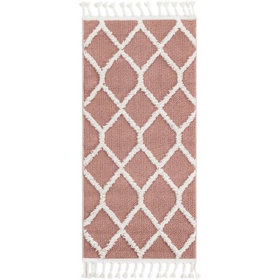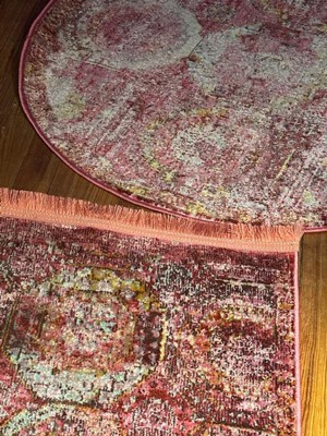 Matches oval rug and large runner at entrance. Perfect size for in front of sliding glass doors to back porch. Love the variation of pinks from light to deep plus small amount of light yellow and small areas of light gray/blue.