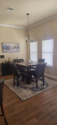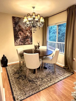 This rug has received high praise for its beautiful colors, quality, and ability to enhance various living spaces. Guests appreciate its versatility, as it complements both modern and traditional decor. Many have noted how well it ties rooms together, making it a perfect addition under dining tables or in living areas. The rug's soft texture and durability have also been highlighted, making it a favorite for homes with pets.