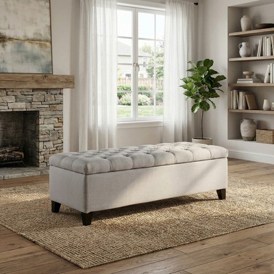 Product Name: Kumasinova 50" Wide Tufted Storage Ottoman, Upholstered Ottoman with Storage, Rectangle Storage Bench with Hinged Lid, Espresso Wood Frame, Beige
