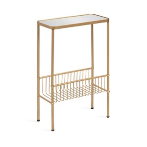 Add the contemporary Trubey side table to your elegant modern home decor. This table combines modern sophistication with pure practicality, featuring a sleek, mirrored glass top and a convenient bottom storage rack. Use it to store your favorite novels, magazines, tablets, and reduce the clutter in your home. It fits perfectly between the living room couches or next to the loveseat with its smaller stature and simple design. However, it's not exclusively made for the living room; use it as a minimalist table in your bedroom or as a place to store mail in your entryway. With its clean, gold look and modern style, the Trubey side table blends seamlessly with any contemporary decor. And with its padded feet, you can move this table around the room without the risk of scuffing your beautiful floors. With its gorgeous minimalistic design and useful functionality, the Trubey side table will be the perfect place to set your morning coffee or store your favorite reading materials. Assemble this metal table in just four simple steps and begin enjoying it and utilizing the additional storage space.