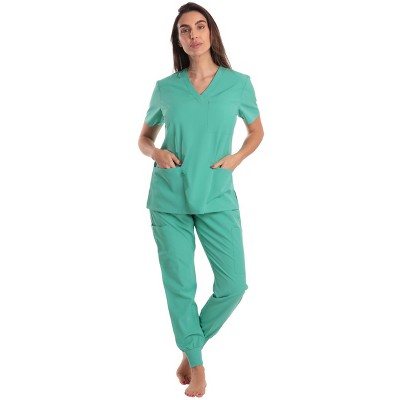 - SCRUB TOPS DESIGNED WITH SUPREME COMFORT IN MIND Work Without RestrictionsWe understand constant movement is a big part of the job. Whether youre responding to an emergency, handling a patient, or power walking through the corridors like a boss, it all involves a great deal of moving around. Thats why we designed our new womens scrub top and pants set to ensure every move is as comfy as can be. The secret behind the freedom of movement? A premium woven blend of 93% polyester and 7% spandex that creates comfy stretch. Experience what all-day comfort feels like. Quality Youll LoveThere is a reason why our medical scrubs are as popular as they are; it all comes down to durability. Scrubs take a lot of abuse. Theyre subjected to one thorough wash after another. To withstand the rigors of the job, we exclusively use high-quality fabric and complement it with reinforced stitching. This means the material remains in great condition, the colors retain their rich look, and the hems stay nice and straight for that clean, professional look. Dont settle for scrubs youll soon have to replace; get some that will give you maximum service.Here are more reasons to love this scrub set:The V-neck top has a cute mock wrap design.Pants have a classic fit to create a figure-flattering look.Total of 6 pockets: 2 on the shirt and 4 on the cargo pants.The pants have an elastic waist and functional drawstring.Available in multiple colors to match your uniform.Comes in a wide range of sizes to suit the plus-sized to the petite.Side vents on the scrub shirt keep you cool for enhanced comfort.Go ahead, complement your shifts with a touch of superior comfort!