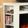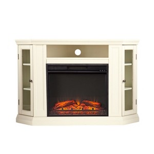 Sold as a set of multiple boxes. For entertainment enthusiasts, this ivory fireplace tops the charts. Triangular media cabinets on either side of the firebox provide plenty of space for your favorite media selections. The media shelf above the firebox is complete with convenient cord access. This fireplace mantel is also designed with a collapsible panel, allowing for versatile placement against a flat wall or corner in your home. The firebox has realistic, multicolor flickering flames and glowing embers with an interior brick design for a more lifelike look. This electric fireplace features energy efficient LED and requires no professional installation, making it a cost effective way to upgrade your living or media room. Easy to use remote control offers4-way adjustability to warm the room conveniently. Safety features include automatic shutoff and glass that remains cool to the touch. Turn off the heat to enjoy the fireplace ambience year round.