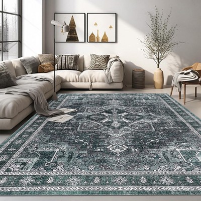 5x7 Washable Vintage Medallion Throw Rug, Non-Slip Non-Shedding Low Pile Carpet for Living Room, Dining Room, Home Office, Grey/Green