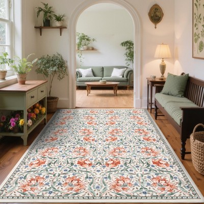 coucheta 5x7ft Vintage Washable Area Rug for Living Room, Retro Floral Non Slip Low Pile Stain Resistant Accent Carpets, for Bedroom, Dining, Beige