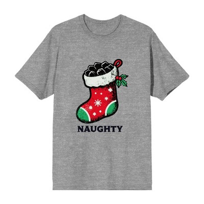 Celebrate the holiday season in style with this crew neck short sleeve apparel. Featuring a festive Christmas stocking stuffed with candy and gifts, accompanied by the word "Nice," this shirt is perfect for holiday gatherings. Made from high-quality materials, it's both comfortable and durable. For easy care, simply machine wash it on cold with like colors and tumble dry on low heat to keep it fresh for future holiday celebrations.