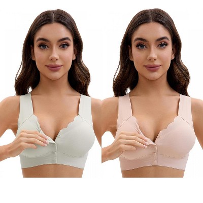 INSPIRE CHIC Front Closure for Women's Lace Full Coverage V Neck Wirefree Adjustable Straps Soft Bras 2 Packs 1 Beige+1 Black Small
