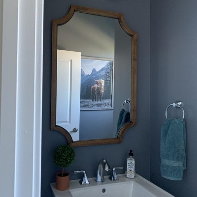- Built of a durable wood material with a large format scalloped shape, hang this mirror confidently anywhere throughout your home including the bathroom or laundry