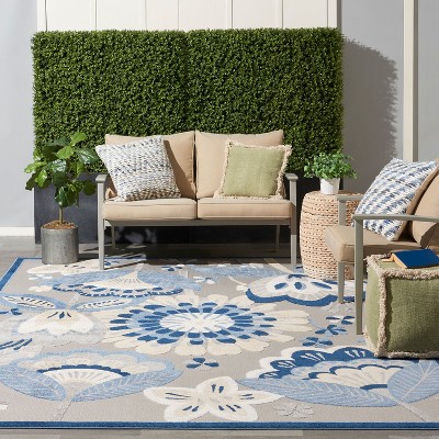 - Contemporary floral indoor/outdoor rug complements a variety of modern decor styles