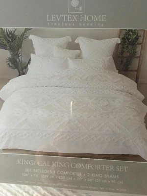 - LEVTEX HARLESON Comforter SET: The Harleson comforter collection is an intricate jacquard in cream tufted chenille and frayed cotton on a white cotton ground. The set consists of a comforter and matching pillow cases.