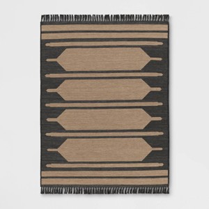 Extend your indoor space outside with this Desert Stripe Outdoor Rug from Threshold™. This woven rug features a tan-colored desert stripe pattern on a charcoal gray background and fringed tassels distinctly marking the short ends. It will go well with any decor or color scheme. Plus, the rectangular rug boasts a flat-pile design that stands up against heavy traffic areas and is easy to hose clean with water.