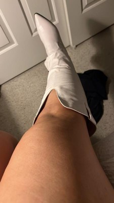 [This review was collected as part of a promotion.] I got these boots in black. They’re VERY comfortable. I ordered wide calf and my calf measures 16”. I had no problems getting them on over leggings and socks. My only problem with them is they’re very soft and shiny. They look almost witchy and not very expensive. I feel like I would like them a lot more in white.