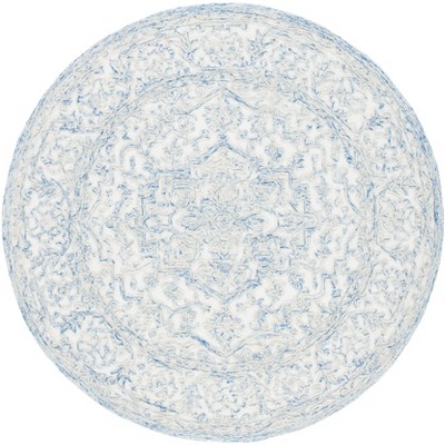 Elevate your living space with this round area rug, measuring 6 feet by 6 feet. Crafted in India, this piece combines blue and ivory tones to create a sophisticated and calming ambiance. The traditional style blends seamlessly with various decor themes, making it a versatile addition to any room. Expertly hand tufted, this rug features a blend of wool and cotton with a touch of latex, offering comfort underfoot. The 3/8 inch height provides a cozy surface that enhances the tactile experience. Its round shape adds a soft, inviting touch to your home. With its timeless design, this rug supports a harmonious atmosphere, enhancing both modern and classic interiors. Bring warmth and elegance to your floor with a piece that embodies craftsmanship and style.